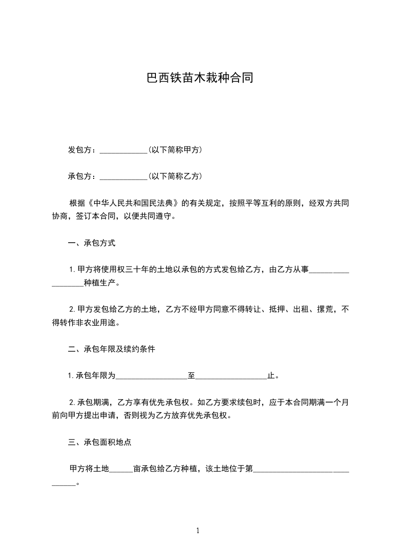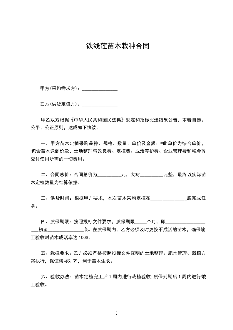 甲方将所承接的___________________________________工程的绿化种植工作承包给乙方施工,依照《中华人民共和国民法典》及其相关法律,为明确双方职责,确保如期保质完成本工程。甲、乙双方在自愿、平等、诚信的基础上,就的相关事项协商一致,并签订如下协议,以期共同遵守。