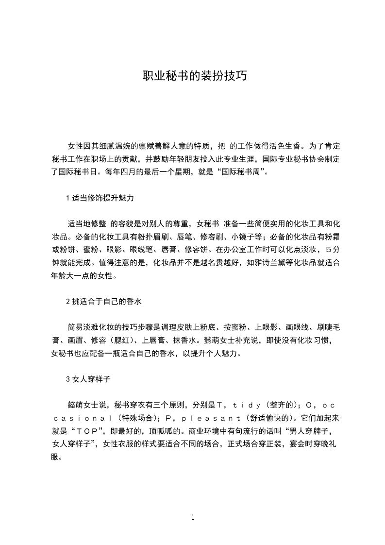 懿萌女士说,秘书穿衣有三个原则,分别是T,tidy(整齐的);O,occasional(特殊场合);P,pleasant(舒适愉快的)。它们加起来就是“TOP”,即最好的,顶呱呱的。商业环境中有句流行的话叫“男人穿牌子,女人穿样子”,女性衣服的样式要适合不同的场合,正式场合穿正装,宴会时穿晚礼服。