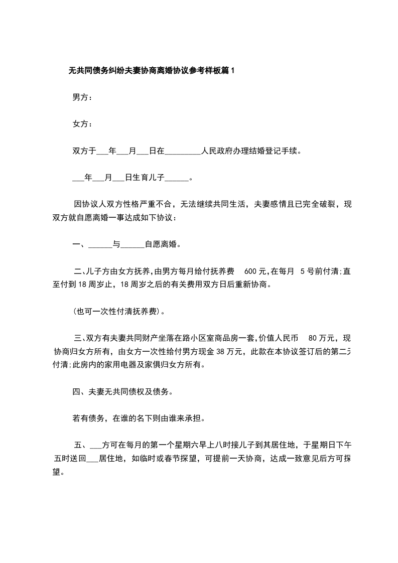 无共同债务纠纷夫妻离婚协议样本篇1