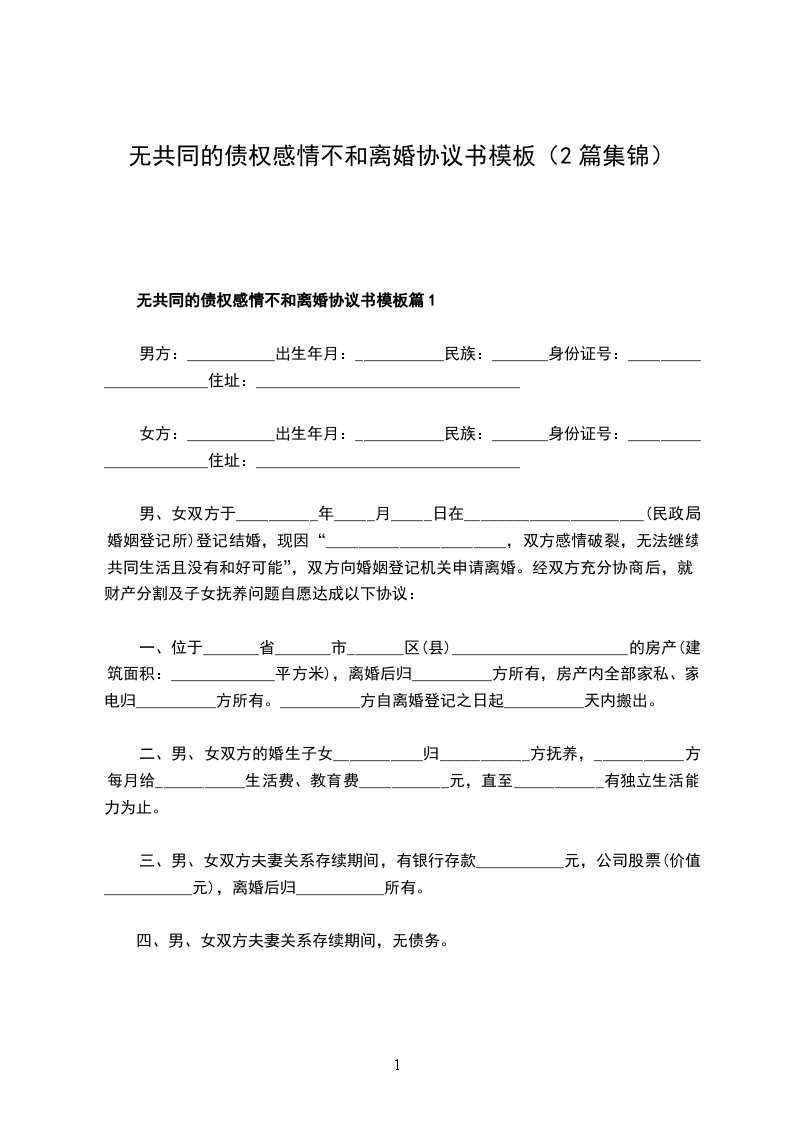 无共同的债权感情不和离婚协议书模板篇1