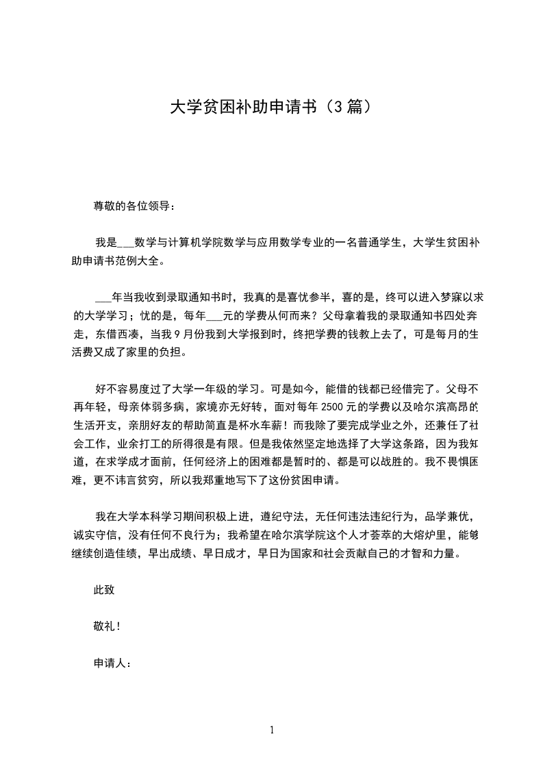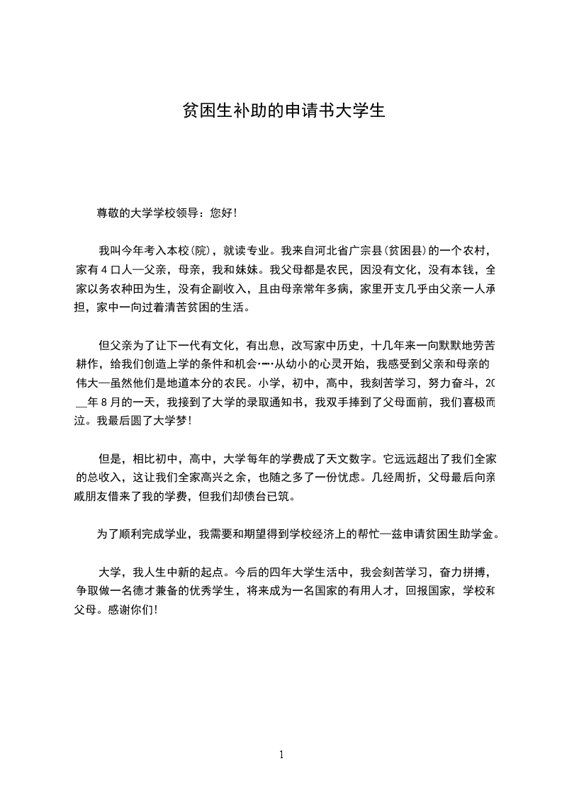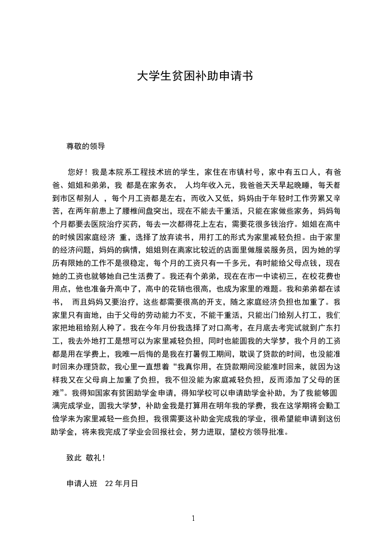 您好!我是本院系工程技术班的学生,家住在市镇村号,家中有五口人,有爸爸 、姐姐和弟弟,我 都是在家务农, 人均年收入元,我爸爸天天早起晚睡,每天都到市区帮别人 ,每个月工资都是左右,而收入又低,妈妈由于年轻时工作劳累又辛苦,在两年前患上了腰椎间盘突出,现在不能去干重活,只能在家做些家务,妈妈每个月都要去医院治疗买药,每去一次都得花上左右,需要花很多钱治疗。姐姐在高中的时候因家庭经济 重,选择了放弃读书,用打工的形式为家里减轻负担。由于家里的经济问题,妈妈的病情,姐姐则在离家比较近的店面里做服装服务员,因为她的学历有限她的工作不是很稳定,每个月的工资只有一千多元,有时能给父母点钱,现在她的工资也就够她自己生活费了。我还有个弟弟,现在在市一中读初三,在校花费也用点,他也准备升高中了,高中的花销也很高,也成为家里的难题。我和弟弟都在读书, 而且妈妈又要治疗,这些都需要很高的开支,随之家庭经济负担也加重了。我家里只有亩地,由于父母的劳动能力不支,不能干重活,只能出门给别人打工,我们家把地租给别人种了。我在今年月份我选择了对口高考,在月底去考完试就到广东打工,我去外地打工是想可以为家里减轻负担,同时也能圆我的大学梦,我个月的工资都是用在学费上,我唯一后悔的是我在打暑假工期间,耽误了贷款的时间,也没能准时回来办理贷款,我心里一直想着“我真你用,在贷款期间没能准时回来,就因为这样我又在父母肩上加重了负担,我不但没能为家庭减轻负担,反而添加了父母的困难”。我得知国家有贫困助学金申请,得知学校可以申请助学金补助,为了我能够圆满完成学业,圆我大学梦,补助金我是打算用在明年我的学费,我在这学期将会勤工俭学来为家里减轻一些负担,我很需要这补助金完成我的学业,很希望能申请到这份助学金,将来我完成了学业会回报社会,努力进取,望校方领导批准。