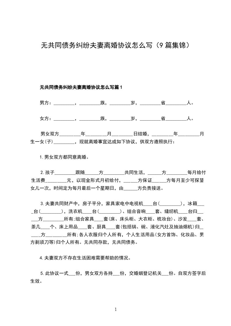 无共同债务纠纷夫妻离婚协议怎么写篇9