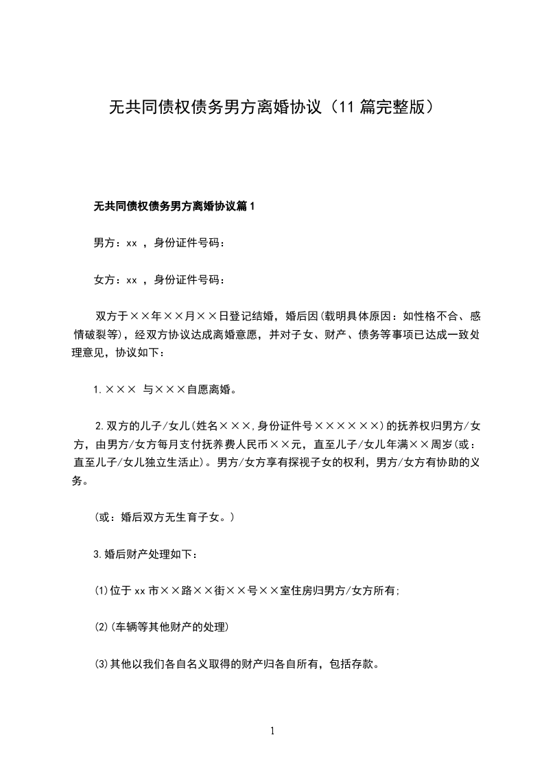 无共同债权债务男方协议离婚范本如何写篇11