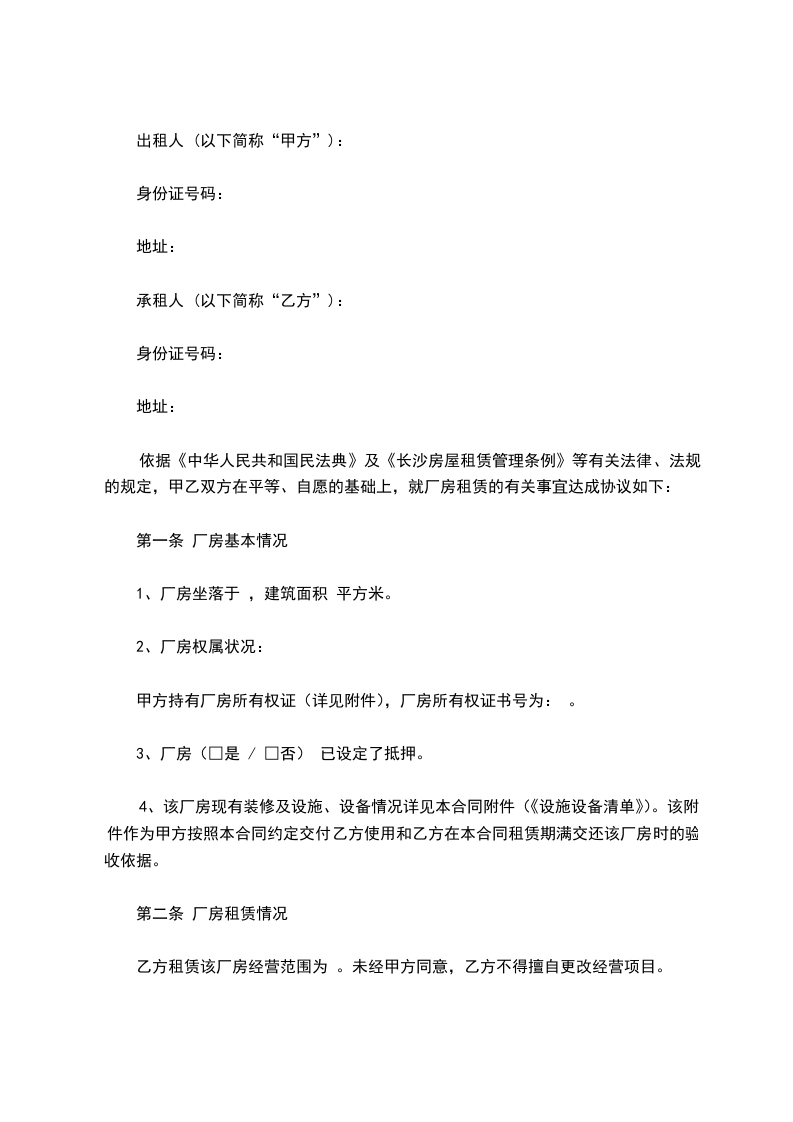 依据《中华人民共和国民法典》及《长沙房屋租赁管理条例》等有关法律、法规的规定,甲乙双方在平等、自愿的基础上,就厂房租赁的有关事宜达成协议如下: