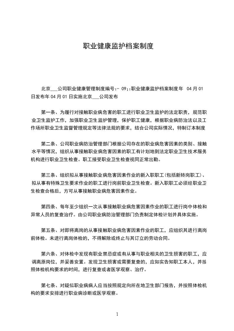 北京___公司职业健康管理制度编号:-09;:职业健康监护档案制度年04月01日发布年04月01日实施北京___公司发布