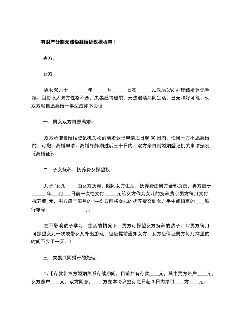 本协议一式三份,一份二张,男、女双方各执一份,婚姻登记机关存档一份,自婚姻登记机颁发《离婚证》之日起生效。