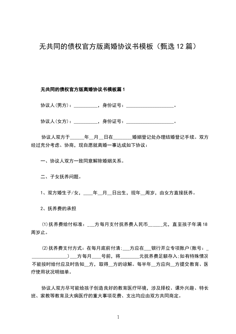 无共同的债权官方版离婚协议书模板篇12