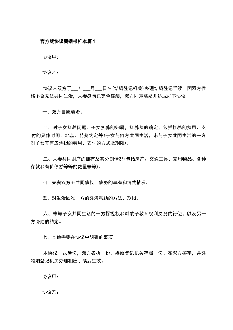 全新官方版协议离婚范本参考样例篇1