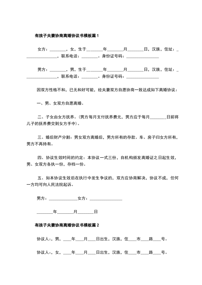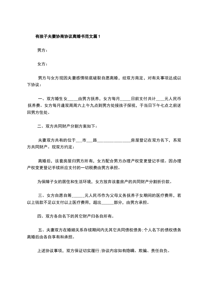 本协议一式三份,一份二张,男、女双方各执一份,婚姻登记机关存档一份,自婚姻登记机颁发《离婚证》之日起生效。