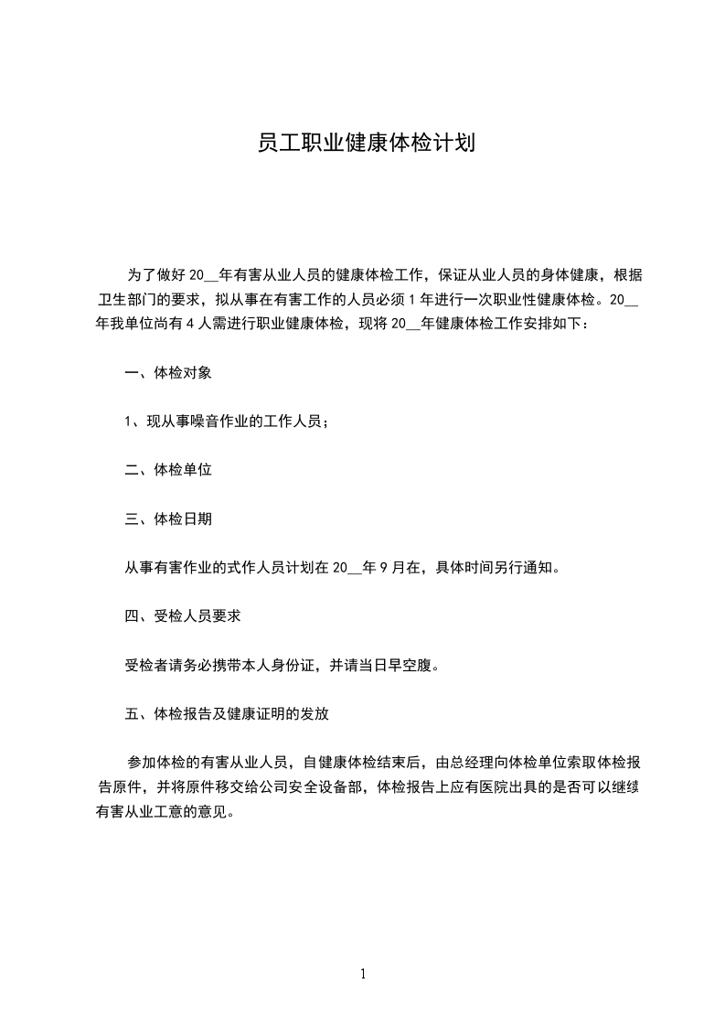 为了做好20__年有害从业人员的健康体检工作,保证从业人员的身体健康,根据卫生部门的要求,拟从事在有害工作的人员必须1年进行一次职业性健康体检。20__年我单位尚有4人需进行职业健康体检,现将20__年健康体检工作安排如下: