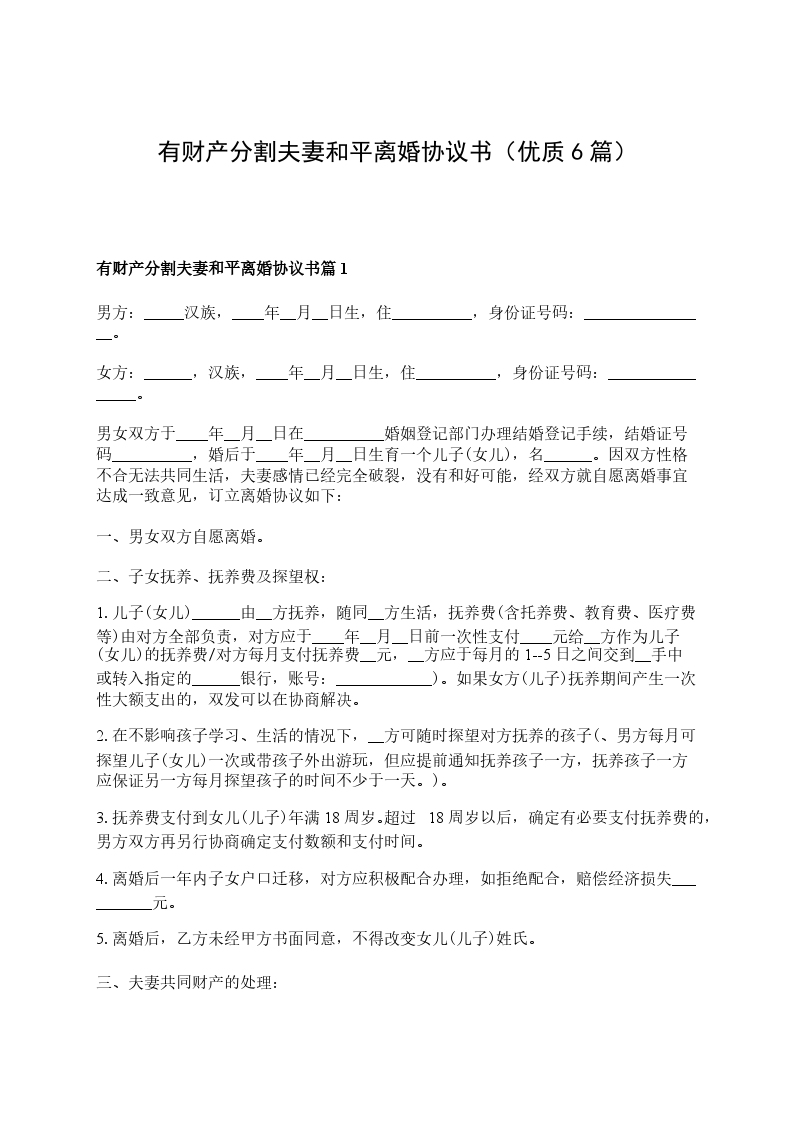 有财产分割夫妻协议离婚范本范文篇6