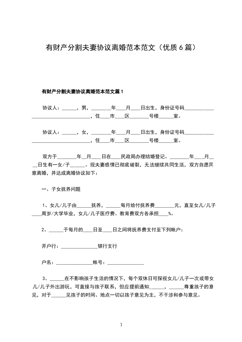 有财产分割夫妻协议离婚范本范文篇1