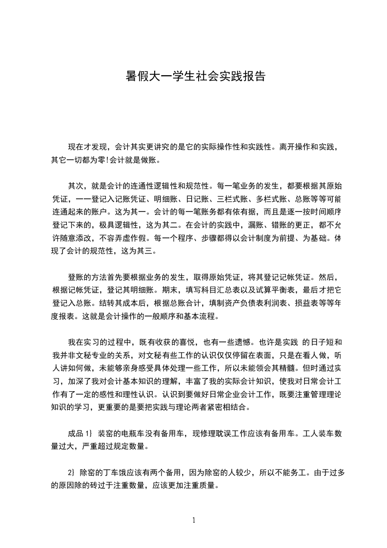 我在实习的过程中,既有收获的喜悦,也有一些遗憾。也许是实践 的日子短和我并非文秘专业的关系,对文秘有些工作的认识仅仅停留在表面,只是在看人做,听人讲如何做,未能够亲身感受具体处理一些工作,所以未能领会其精髓。但时通过实习,加深了我对会计基本知识的理解,丰富了我的实际会计知识,使我对日常会计工作有了一定的感性和理性认识。认识到要做好日常企业会计工作,既要注重管理理论知识的学习,更重要的是要把实践与理论两者紧密相结合。