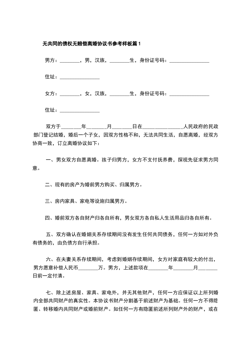 九、因支付房屋的首付款,向男方父母所借的_____万元人民币债务,由男方归还。双方无任何其他夫妻共同债权、债务。
