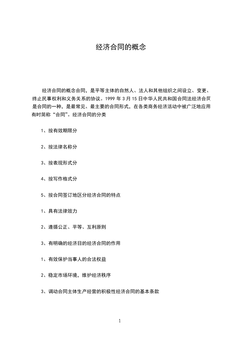 经济合同的概念合同,是平等主体的自然人、法人和其他组织之间设立、变更、终止民事权利和义务关系的协议。1999年3月15日中华人民共和国合同法经济合同是合同的一种,是最常见、最主要的合同形式,在各类商务经济活动中被广泛地应用,有时简称“合同”。经济合同的分类