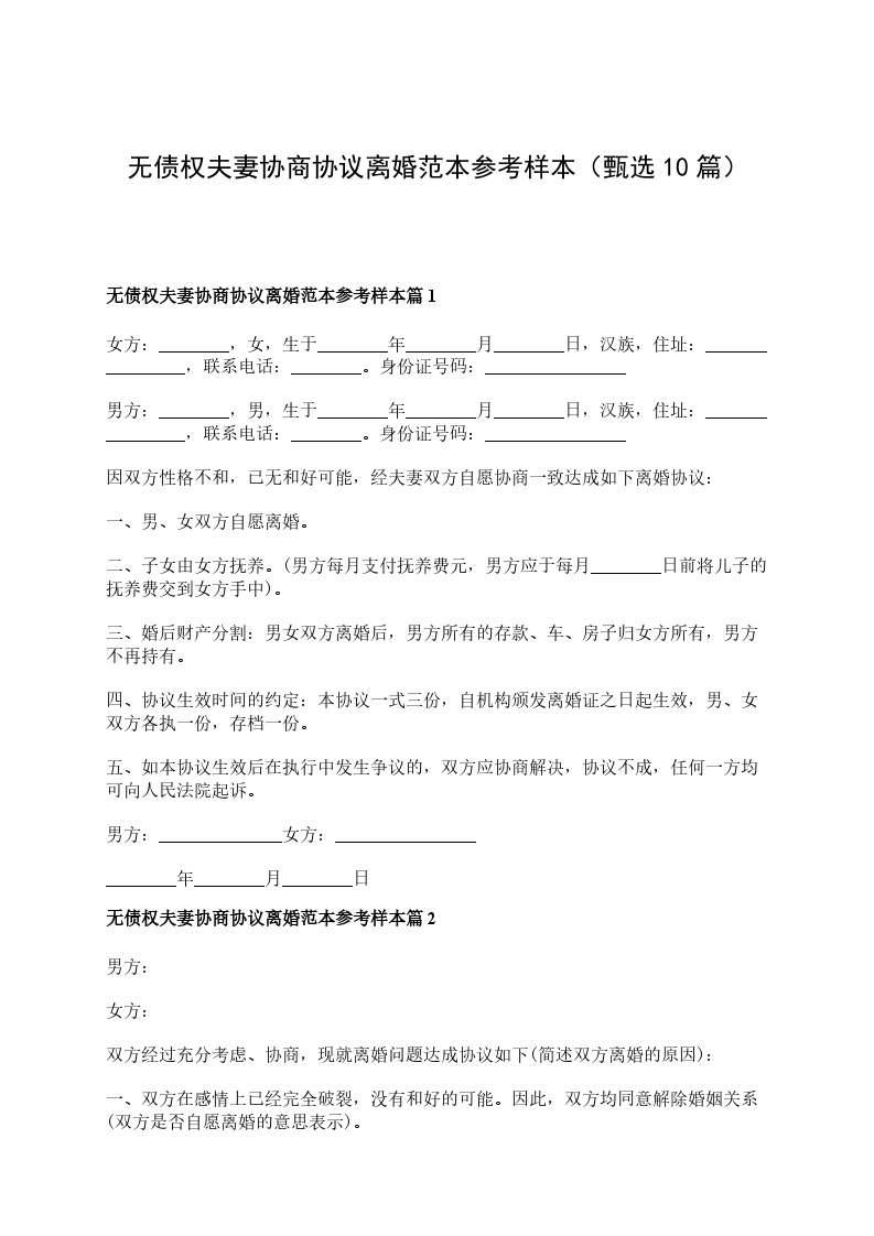 九、本协议一式________份,自婚姻登记处颁发离婚证之日起生效,男、女双方各执________份,婚姻登记机关存档一份。