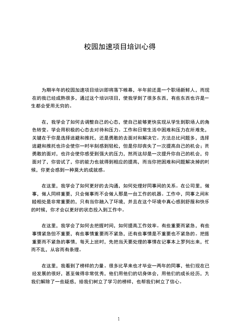 在,我学会了如何去调整自己的心态,使自己能够更快实现从学生到职场人的角色转变。学会用积极的心态去对待和压力。工作和日常生活中困难和压力在所难免,关键在于你是选择逃避和推托,还是勇敢的去面对和解决它。方法总比问题多,选择逃避和推托也许会使你一时半刻感到轻松,但是你却丧失了一次提高自己的机会;而勇敢的面对,也许会使你感受到强大的压力,然而这却是一次提升你自己的机会,你面对了,你尝试了,你的能力也就得到相应的提高,而当你把困难和问题解决掉的时候,你更会感到一种莫大的成就感。
