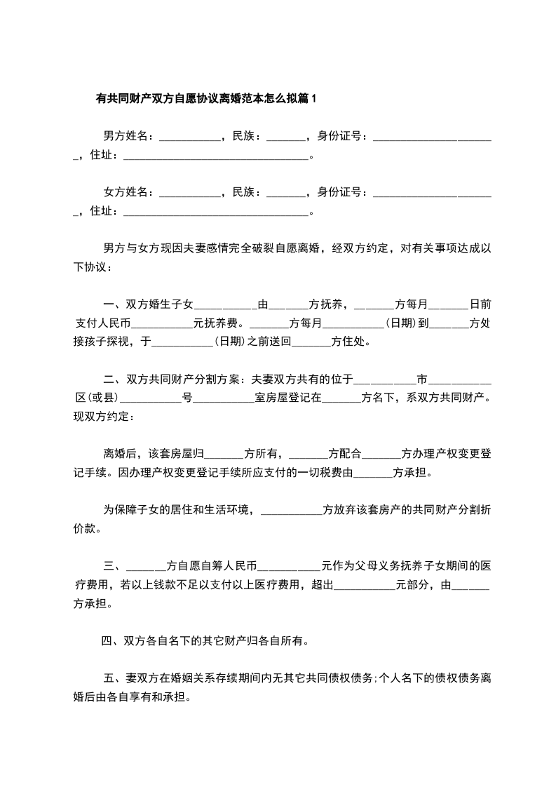 有共同财产自愿离婚协议书怎么拟篇5