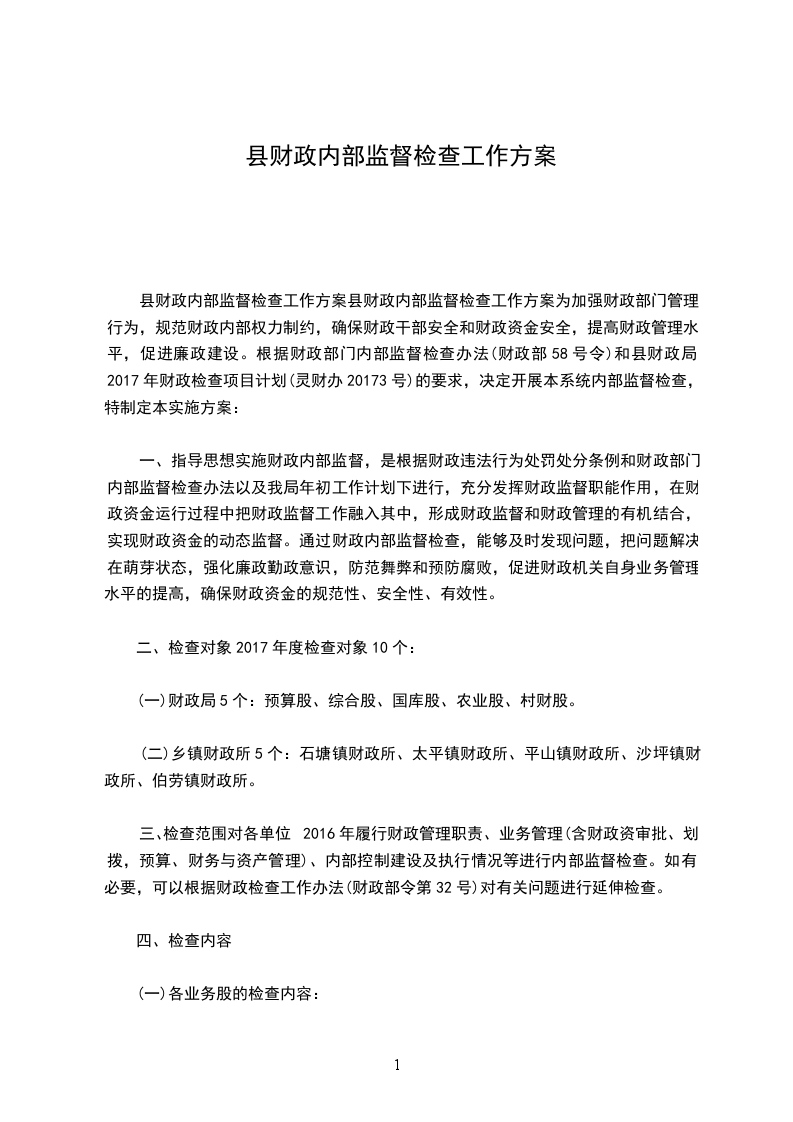 县财政内部监督检查工作方案县财政内部监督检查工作方案为加强财政部门管理行为,规范财政内部权力制约,确保财政干部安全和财政资金安全,提高财政管理水平,促进廉政建设。根据财政部门内部监督检查办法(财政部58号令)和县财政局2024年财政检查项目计划(灵财办20243号)的要求,决定开展本系统内部监督检查,特制定本实施方案:
