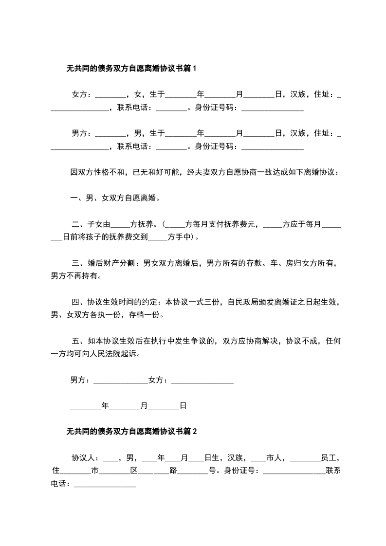 □双方确认在婚姻关系存续期间没有发生任何共同债务,任何一方如对外负有债务的,由负债方自行承担。