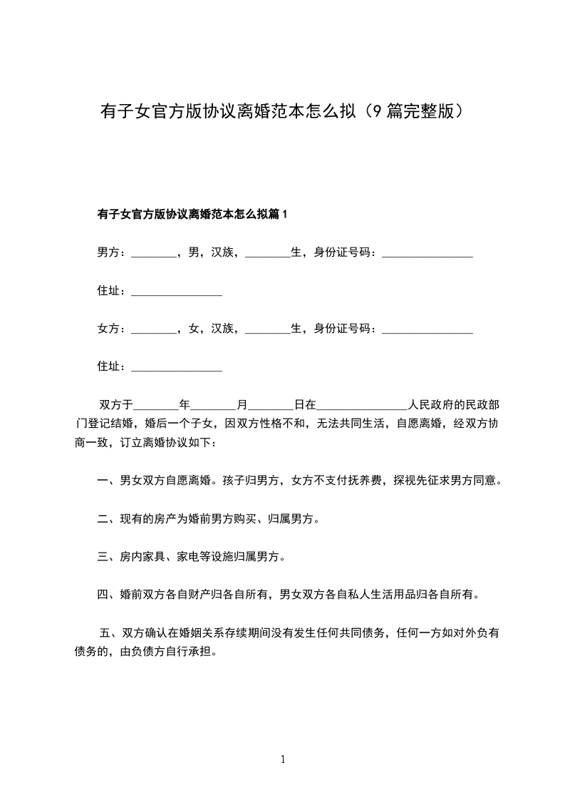 双方于________年________月________日在________________人民政府的民政部门登记结婚,婚后一个子女,因双方性格不和,无法共同生活,自愿离婚,经双方协商一致,订立离婚协议如下: