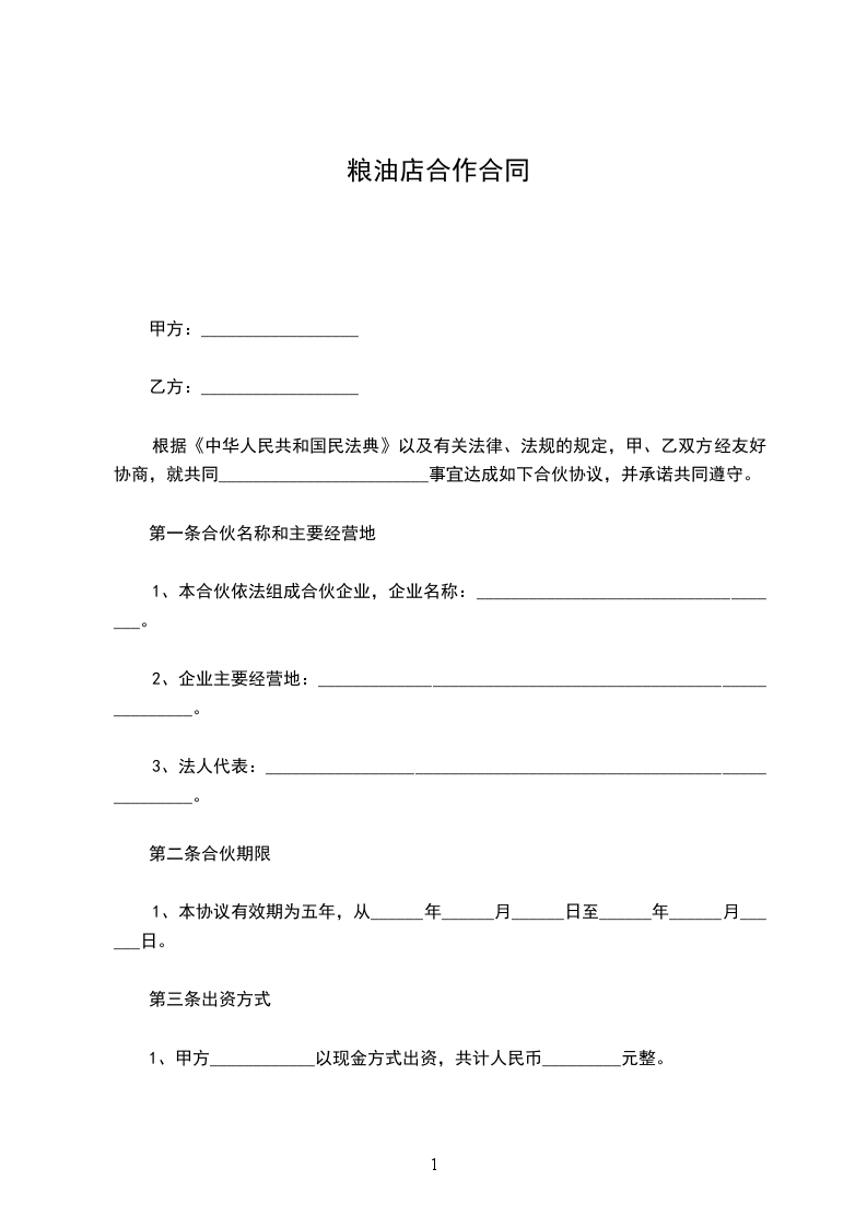 4、本合伙出资共计人民币_________元整。合伙期间各合伙人的出资为共有财产,不得随意请求分割,合伙终止后,所有财产为各合伙人平分。