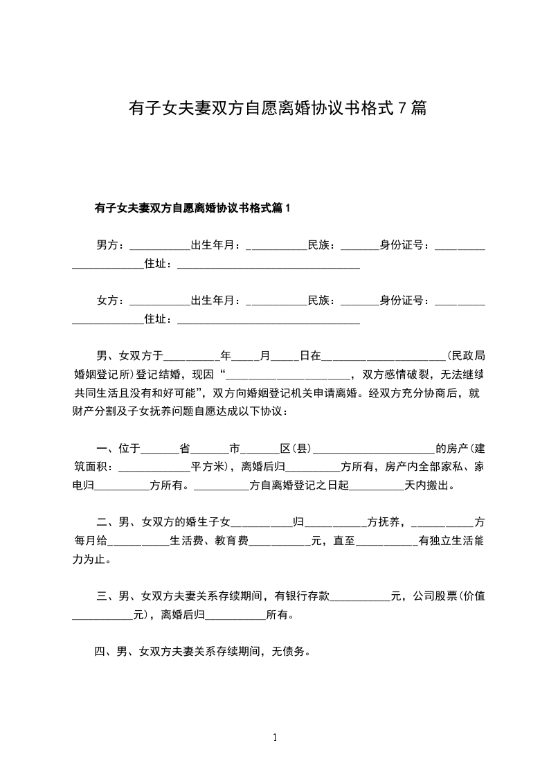 本协议书系双方真实意思表示,上述内容全部真实有效,一旦提供虚假情况,双方当事人自愿承担一切法律后果。本协议书一式____份,婚姻登记机关存档____份,双方各执____份,双方签字,并经婚姻登记机关办理离婚登记后生效。