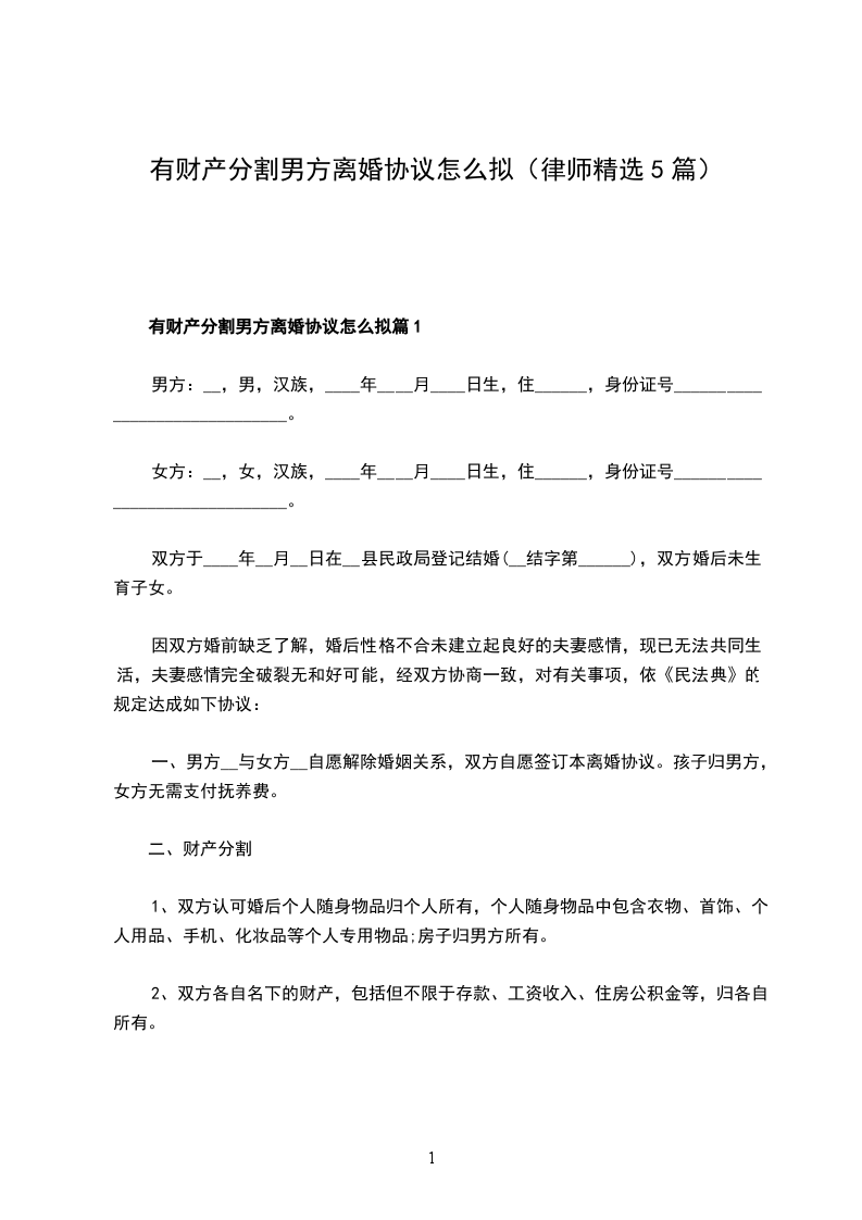 有财产分割男方离婚协议怎么拟篇5