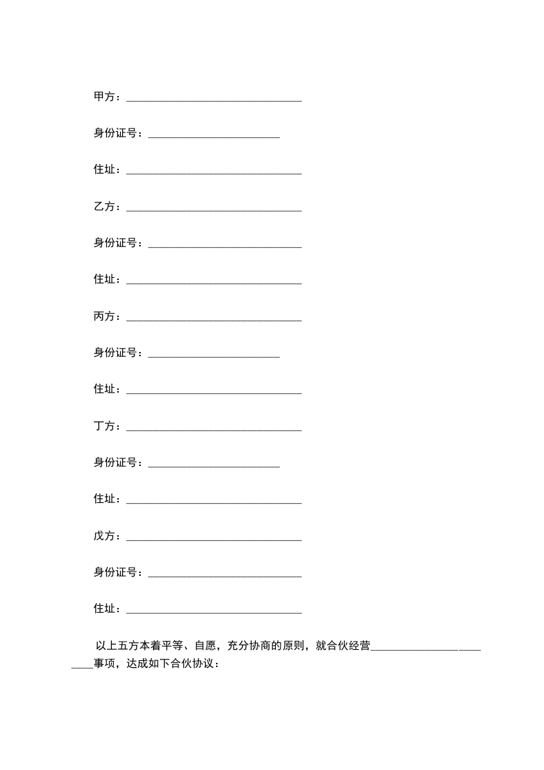 以上五方本着平等、自愿,充分协商的原则,就合伙经营________________________事项,达成如下合伙协议: