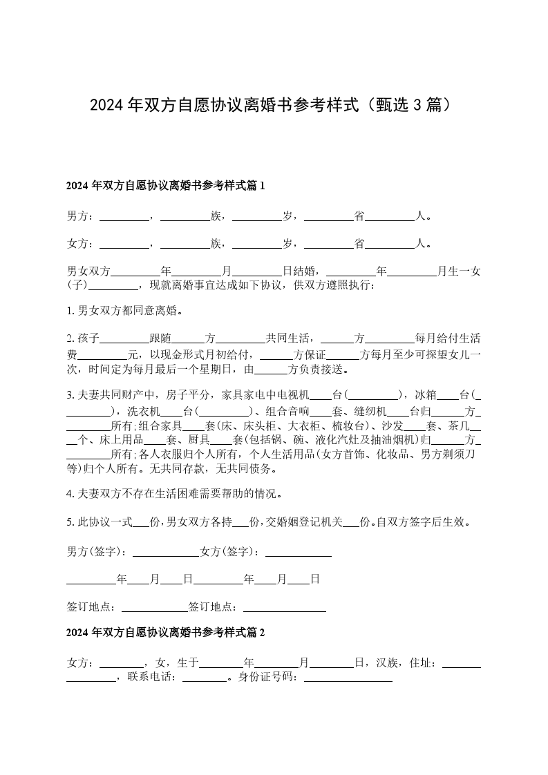 2024双方自愿协议离婚范本参考格式篇3