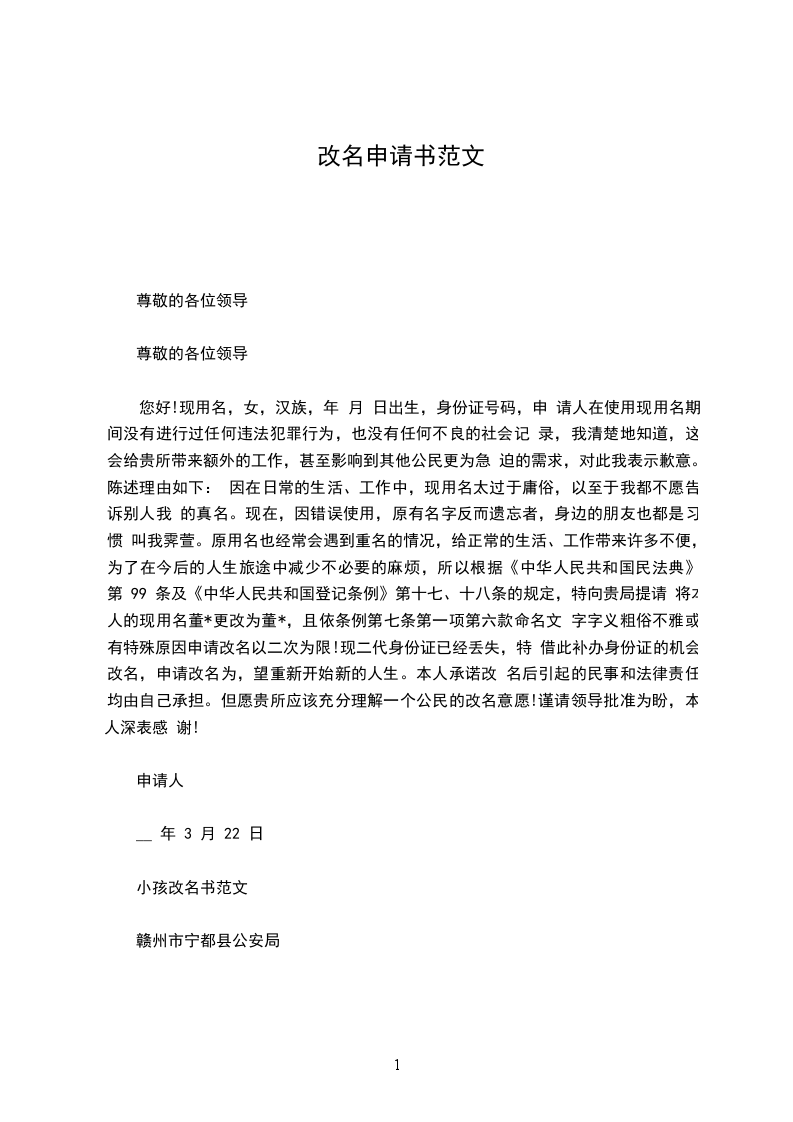 本人现用名___,汉族,女,____年__月__日出生,身份证号:__________,申请人现在所有的身份文件学历证书、银行帐号和社会保险登记等均使用这一名字,申请人在使用现用名期间没有进行过任何违法、犯罪行为,也没有任何不良的社会记录,我清楚知道,我这一申请会给贵单位带来额外的工作,甚至影响到其他公民更为急迫的需求,对此我深表歉。改名原因如下:一.因在日常的生活、工作中,经常遇到重名的情况,给正常的生活、工作带来许多不便;二.因本人在赣州市蓝天世纪幼儿园工作,办暂住证已用我所要改为的名字(___)而与我现身份证名字不符。,故,有一些不便。所以根据《中华人民共和国民法典》第99条及《中华人民共和国户口登记条例》第十七、十八条的规定,特向贵局提请将本人的现用名___更改为___,本人承诺改名所引起的民事和法律责任均由自己承担,望同意为切!