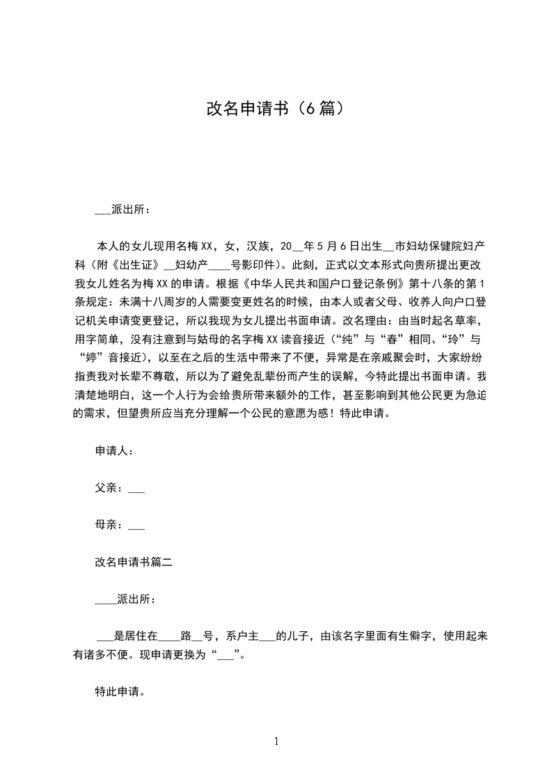 光明里派出所本人现居住于,女儿居民户口簿上的名字是,女,汉族,生,身份证号:现在,正式以文本形式向贵所提出更改我女儿姓名为的申请。根据《中华人民共和国户口登记条例》第十八条的第1条规定:未满十八周岁的人需要变更姓名的时候,由本人或者父母收养人向户口登记机关申请变更登记,所以我现为女儿提出书面申请。改名理由:由于当时起名草率,重名率太高,为方便以后的升学和就业,现特提出书面改名申请。我知道,这样会给贵所带来额外的工作,但还是肯请贵所予以批准我为女儿的改名申请为谢!特此申请