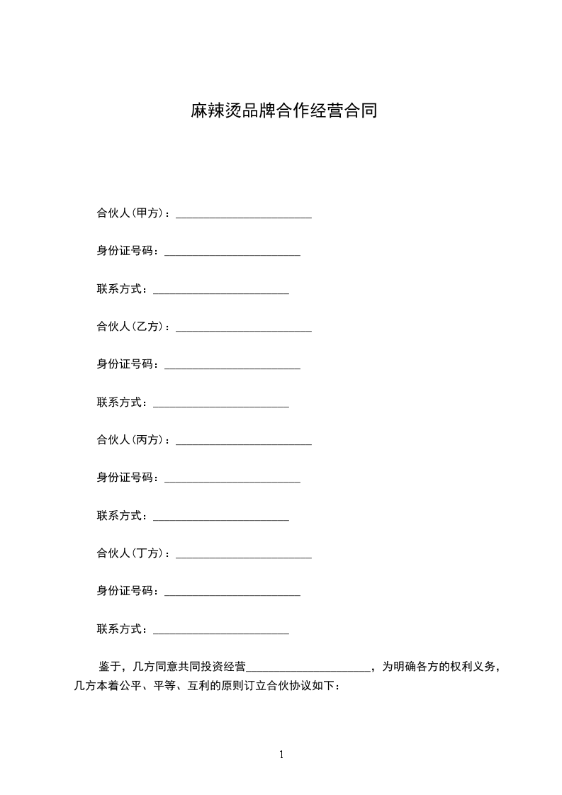 鉴于,几方同意共同投资经营______________________,为明确各方的权利义务,几方本着公平、平等、互利的原则订立合伙协议如下: