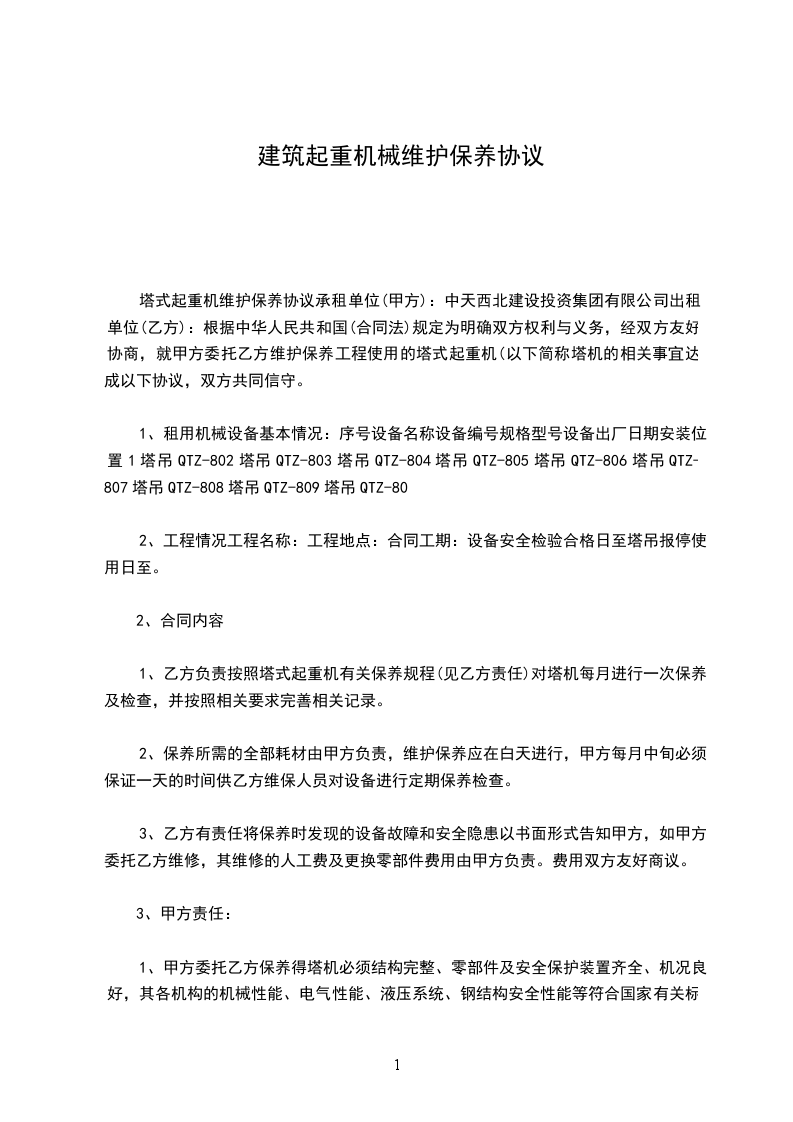 塔式起重机维护保养协议承租单位(甲方):中天西北建设投资集团有限公司出租单位(乙方):根据中华人民共和国(合同法)规定为明确双方权利与义务,经双方友好协商,就甲方委托乙方维护保养工程使用的塔式起重机(以下简称塔机的相关事宜达成以下协议,双方共同信守。