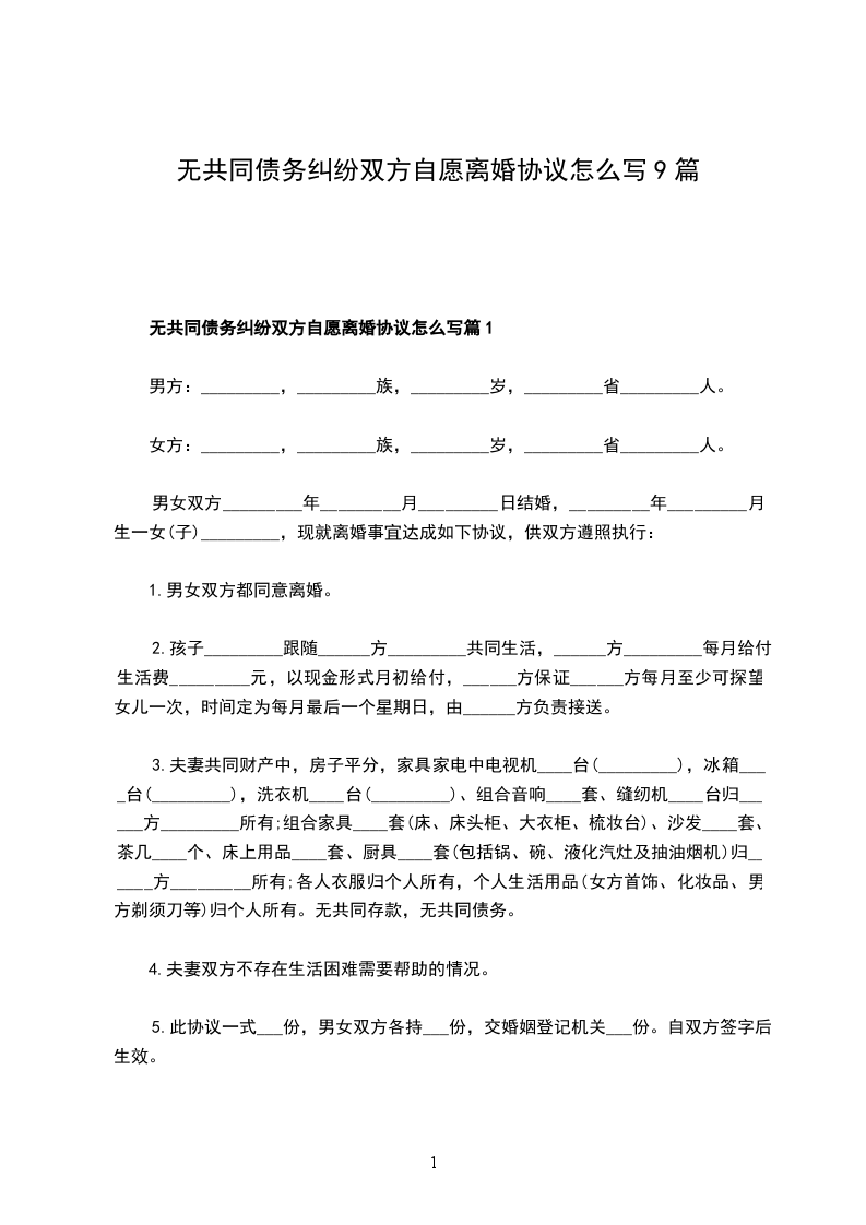 无债务纠纷双方自愿协议离婚范本参考样例篇9