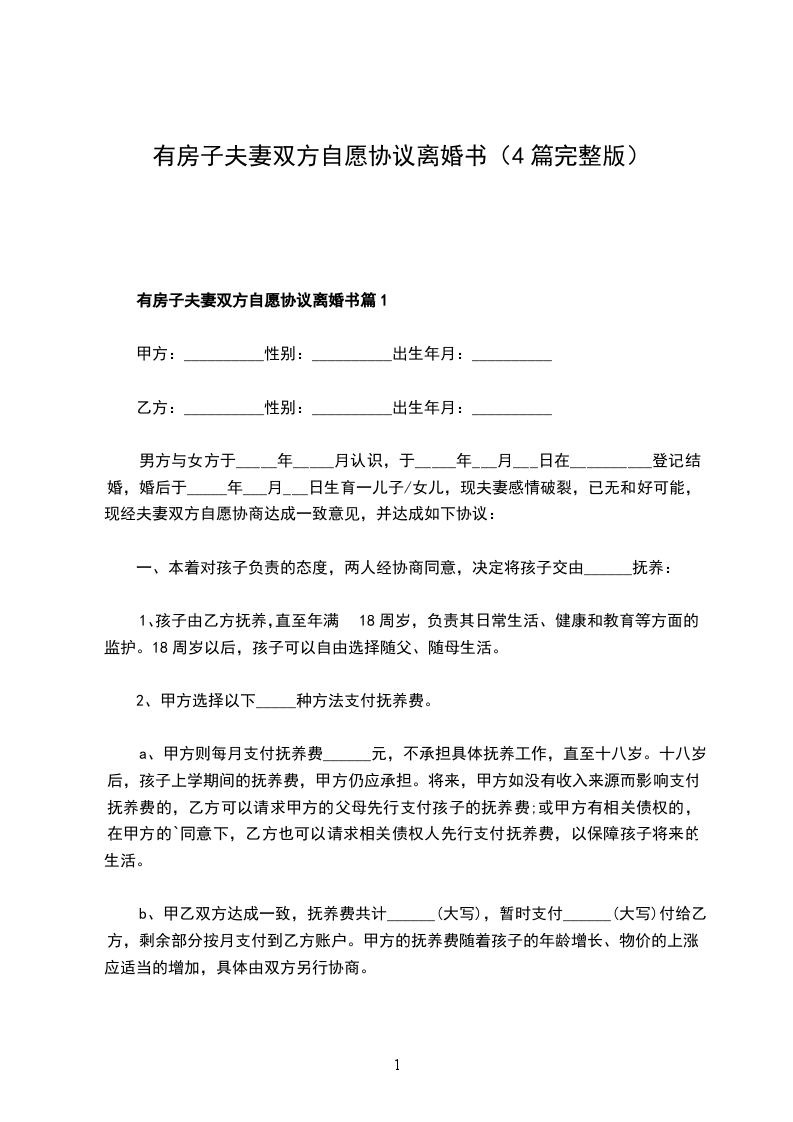 (1)夫妻婚后共有房屋坐落在__________________住房一套。现协商该套房产归______方所有,______方同意在办理完离婚手续后配合______方办理产权变更手续。