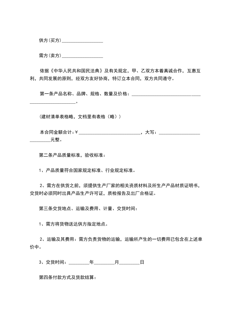 依据《中华人民共和国民法典》、《中华人民共和国建筑法》及相关法律法规,本着互惠互利、合作共赢的原则,经甲乙双方友好协商,现就供方购买需方______________事宜达成如协议: