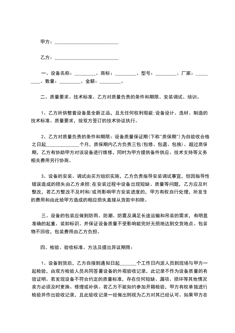 2、乙方对质量负责的条件和期限:设备质量保证期(下称"质保期")为自验收合格之日起______________个月,质保期内乙方负责三包(包修、包退、包换)。超过质保期,乙方有协助甲方对该设备进行维修,同时为甲方提供备件供应、技术支持等义务,相关费用另行协商。