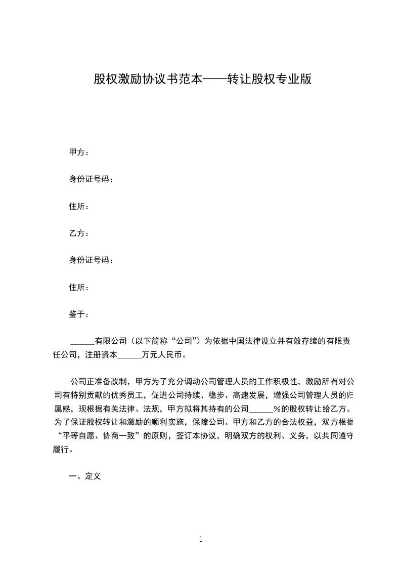 公司正准备改制,甲方为了充分调动公司管理人员的工作积极性,激励所有对公司有特别贡献的优秀员工,促进公司持续、稳步、高速发展,增强公司管理人员的归属感,现根据有关法律、法规,甲方拟将其持有的公司______%的股权转让给乙方。为了保证股权转让和激励的顺利实施,保障公司、甲方和乙方的合法权益,双方根据“平等自愿、协商一致”的原则,签订本协议,明确双方的权利、义务,以共同遵守履行。