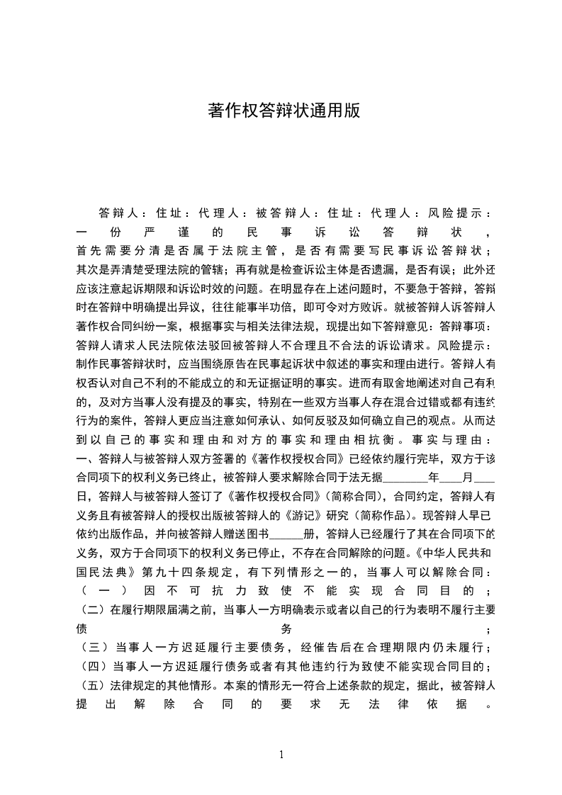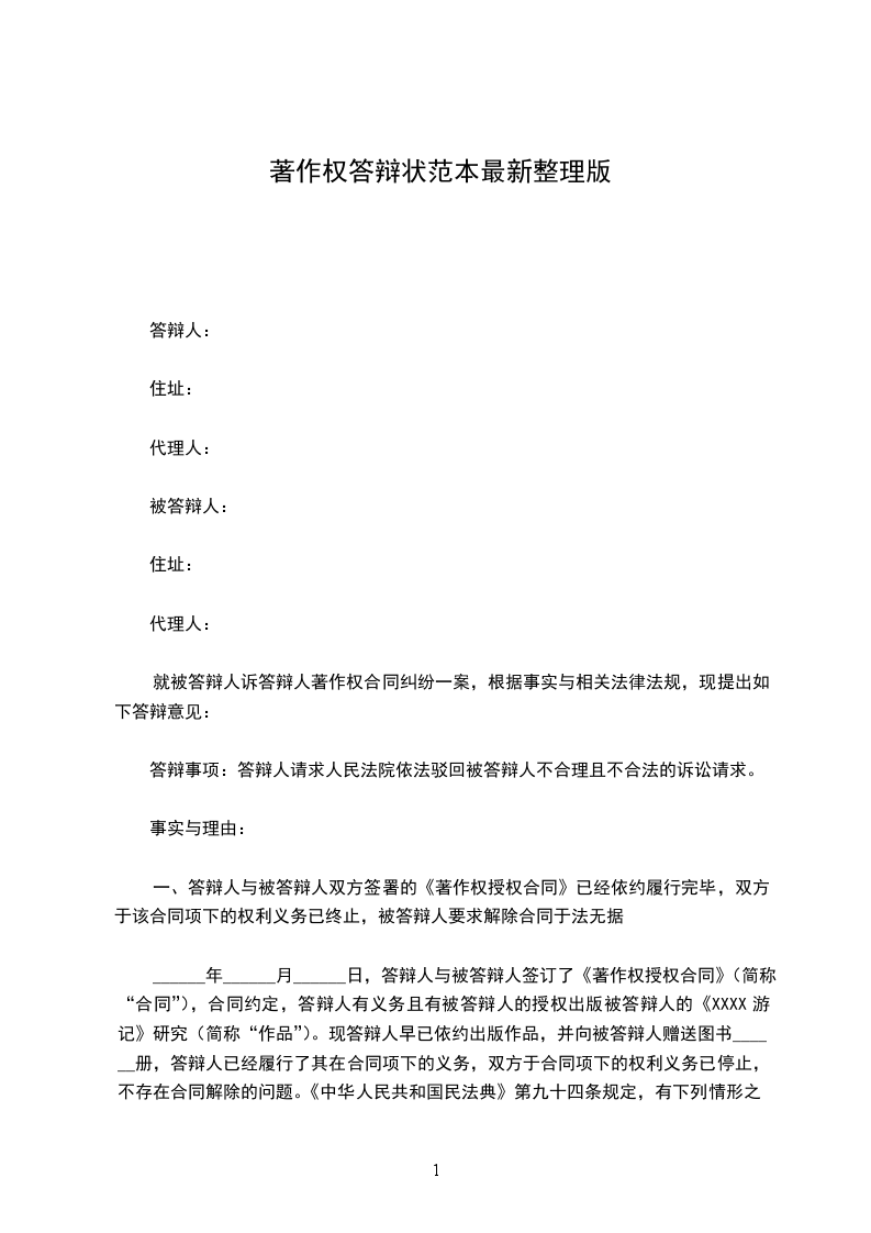 ______年______月______日,答辩人与被答辩人签订了《著作权授权合同》(简称“合同”),合同约定,答辩人有义务且有被答辩人的授权出版被答辩人的《XXXX游记》研究(简称“作品”)。现答辩人早已依约出版作品,并向被答辩人赠送图书______册,答辩人已经履行了其在合同项下的义务,双方于合同项下的权利义务已停止,不存在合同解除的问题。《中华人民共和国民法典》第九十四条规定,有下列情形之一的,当事人可以解除合同:(一)因不可抗力致使不能实现合同目的;(二)在履行期限届满之前,当事人一方明确表示或者以自己的行为表明不履行主要债务;(三)当事人一方迟延履行主要债务,经催告后在合理期限内仍未履行;(四)当事人一方迟延履行债务或者有其他违约行为致使不能实现合同目的;(五)法律规定的其他情形。本案的情形无一符合上述条款的规定,据此,被答辩人提出解除合同的要求无法律依据。