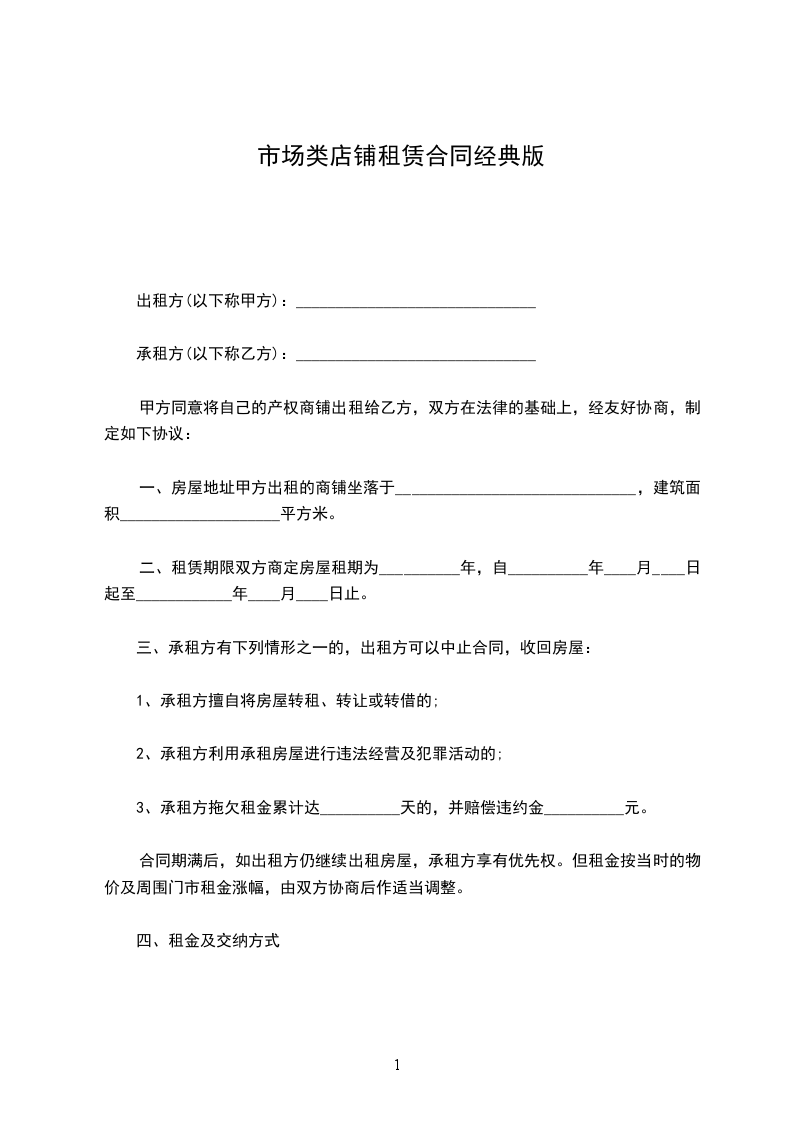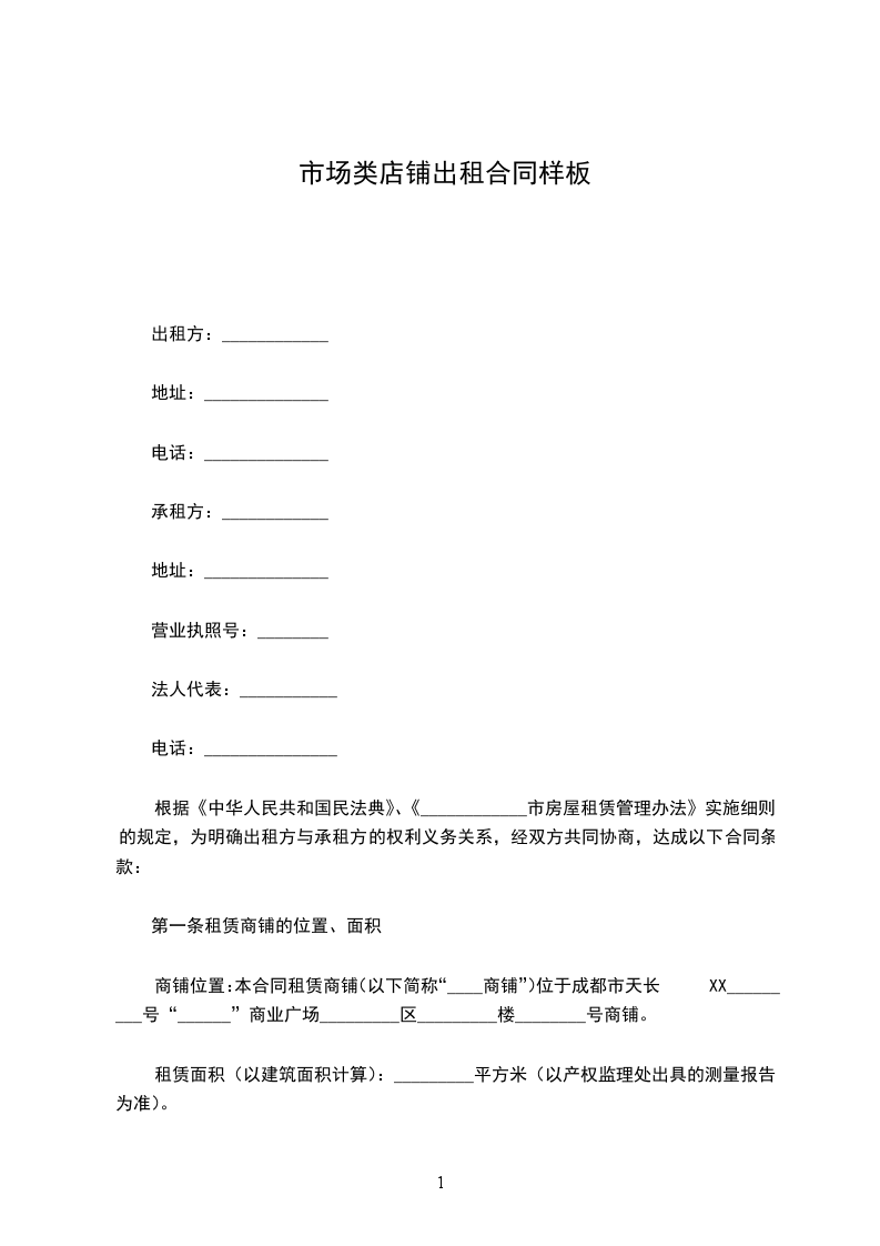 一、房屋地址甲方出租的商铺坐落于______________________________,建筑面积____________________平方米。