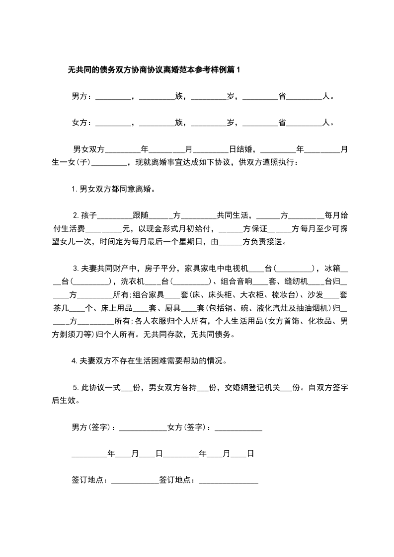 三、债权债务事项:男女双方婚姻存续期间无共同债权债务,任何一方隐瞒债务的,由负债方负责承担,另一方不承担任何责任,无债权债务纠纷。