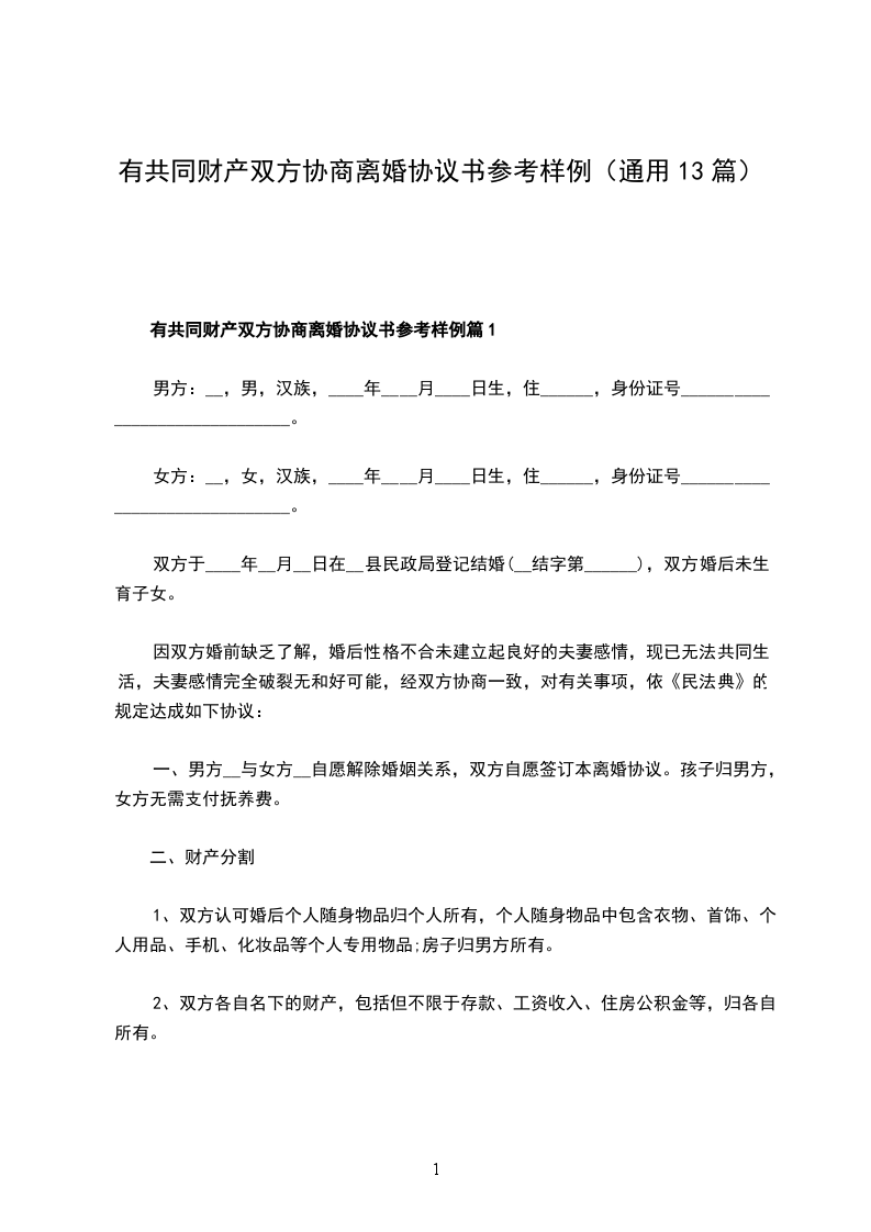 1.存款:双方名下现有银行存款共元,双方各分一半,为元。分配方式:各自名下的存款保持不变,但男方/女方应于年月日前一次性支付元给女方/男方。
