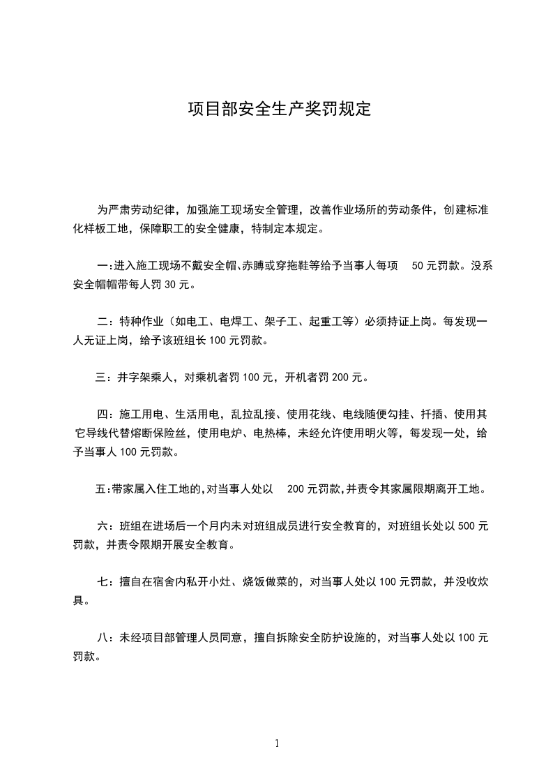 5、每周二晚上程序文件学完之后,项目管理人员进行安全学习。安全生产奖惩制为了贯彻执行中建总字第152号文“关于安全生产奖罚的几项规定”,结合家行施工现场的情况,特制定安全生产的几项规定。