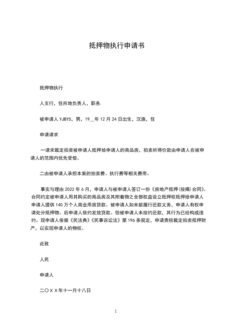 事实与理由2024年6月,申请人与被申请人签订一份《房地产抵押(按揭)合同》。合同约定被申请人用其购买的商品房及其附着物之全部权益设立抵押权抵押给申请人。申请人提供140万个人商业用房贷款。被申请人如未能履行还款义务,申请人有权申请处分抵押物。后申请人依约发放贷款。但被申请人未按约还款,其行为已经构成违约。现申请人依据《民法典》《民事诉讼法》第196条规定,申请贵院裁定拍卖抵押财产,以实现申请人的物权。