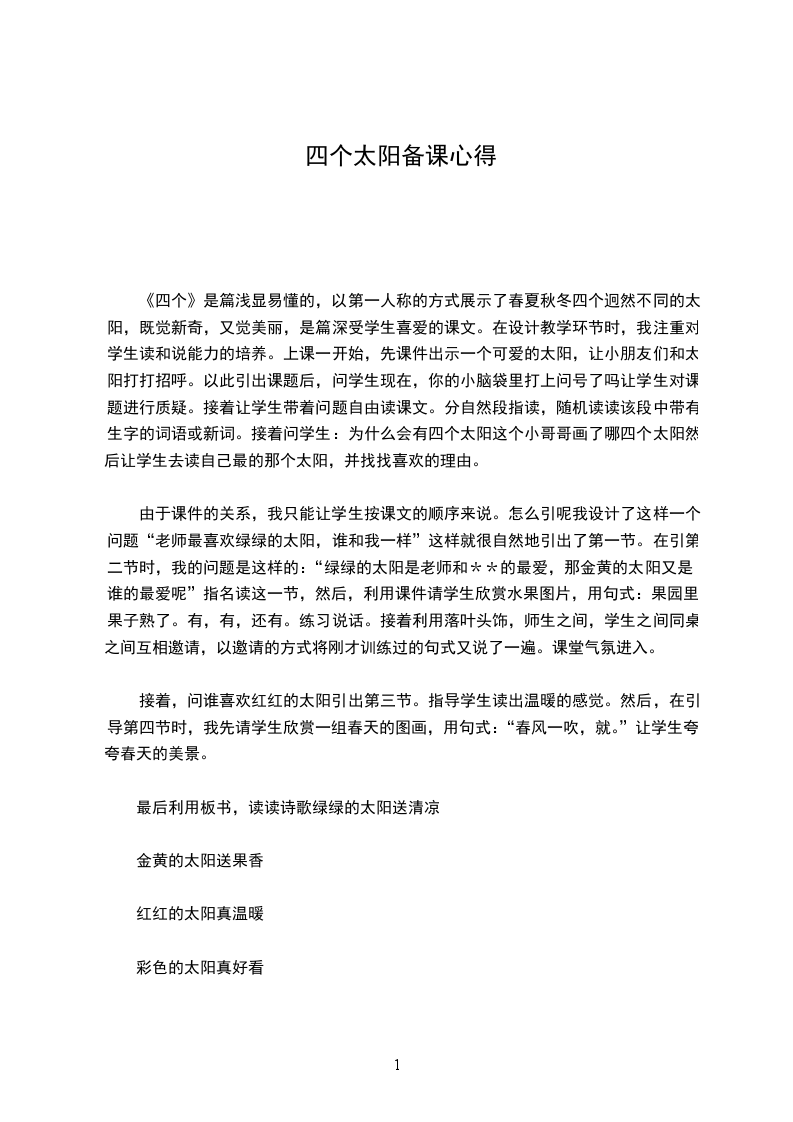 《四个》是篇浅显易懂的,以第一人称的方式展示了春夏秋冬四个迥然不同的太阳,既觉新奇,又觉美丽,是篇深受学生喜爱的课文。在设计教学环节时,我注重对学生读和说能力的培养。上课一开始,先课件出示一个可爱的太阳,让小朋友们和太阳打打招呼。以此引出课题后,问学生现在,你的小脑袋里打上问号了吗让学生对课题进行质疑。接着让学生带着问题自由读课文。分自然段指读,随机读读该段中带有生字的词语或新词。接着问学生:为什么会有四个太阳这个小哥哥画了哪四个太阳然后让学生去读自己最的那个太阳,并找找喜欢的理由。