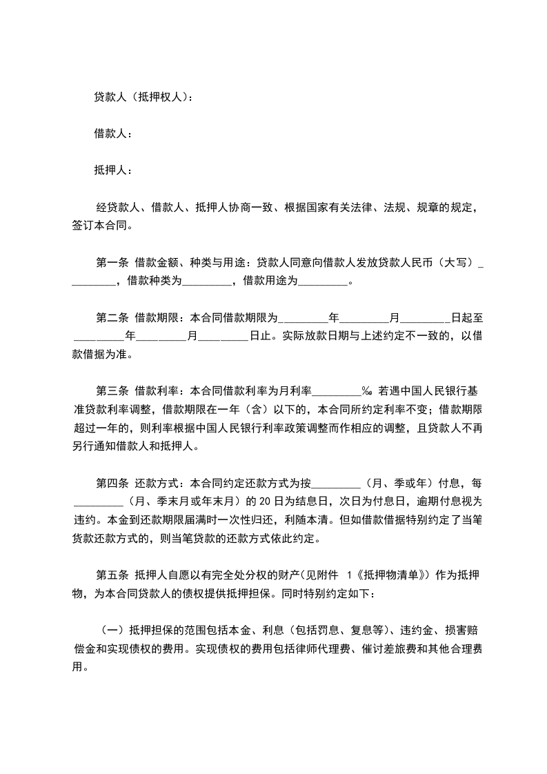 第五条 抵押人自愿以有完全处分权的财产(见附件1《抵押物清单》)作为抵押物,为本合同贷款人的债权提供抵押担保。同时特别约定如下: