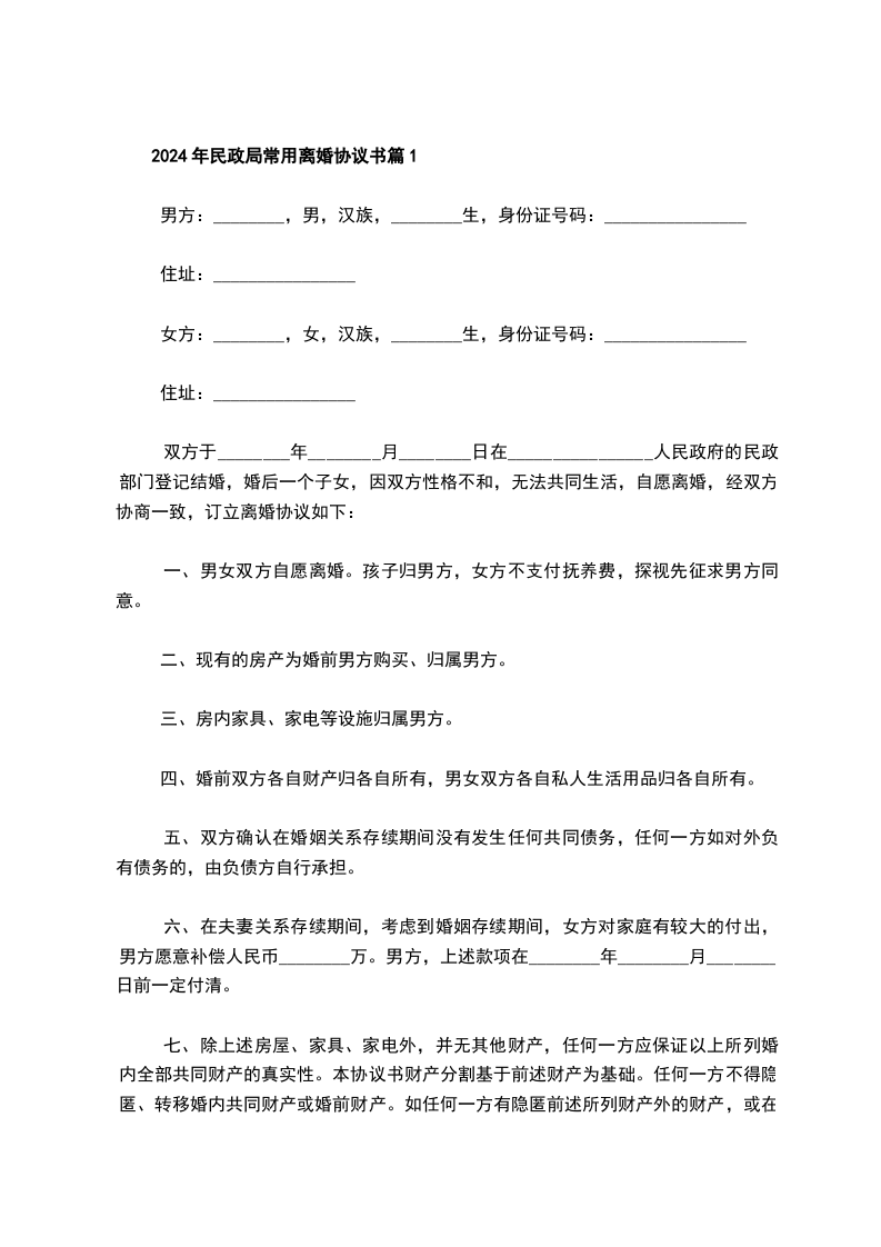 2024年民政局常用离婚协议书篇1