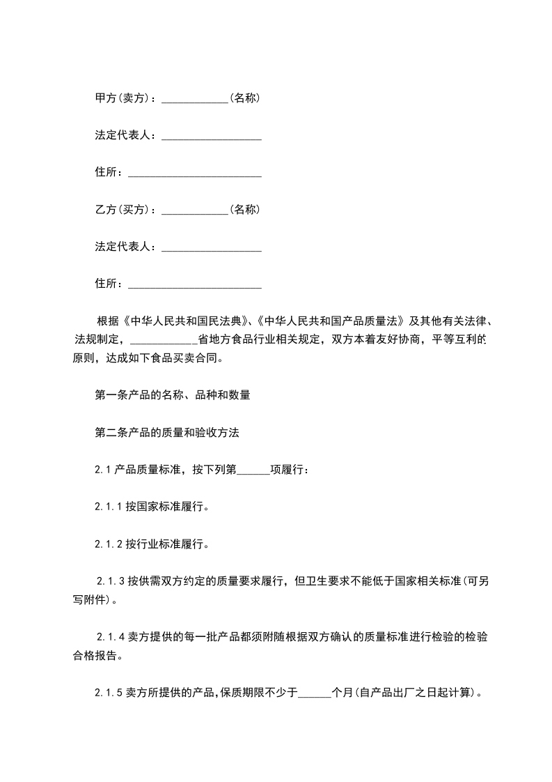根据《中华人民共和国民法典》、《中华人民共和国产品质量法》及其他有关法律、法规制定,____________省地方食品行业相关规定,双方本着友好协商,平等互利的原则,达成如下食品买卖合同。
