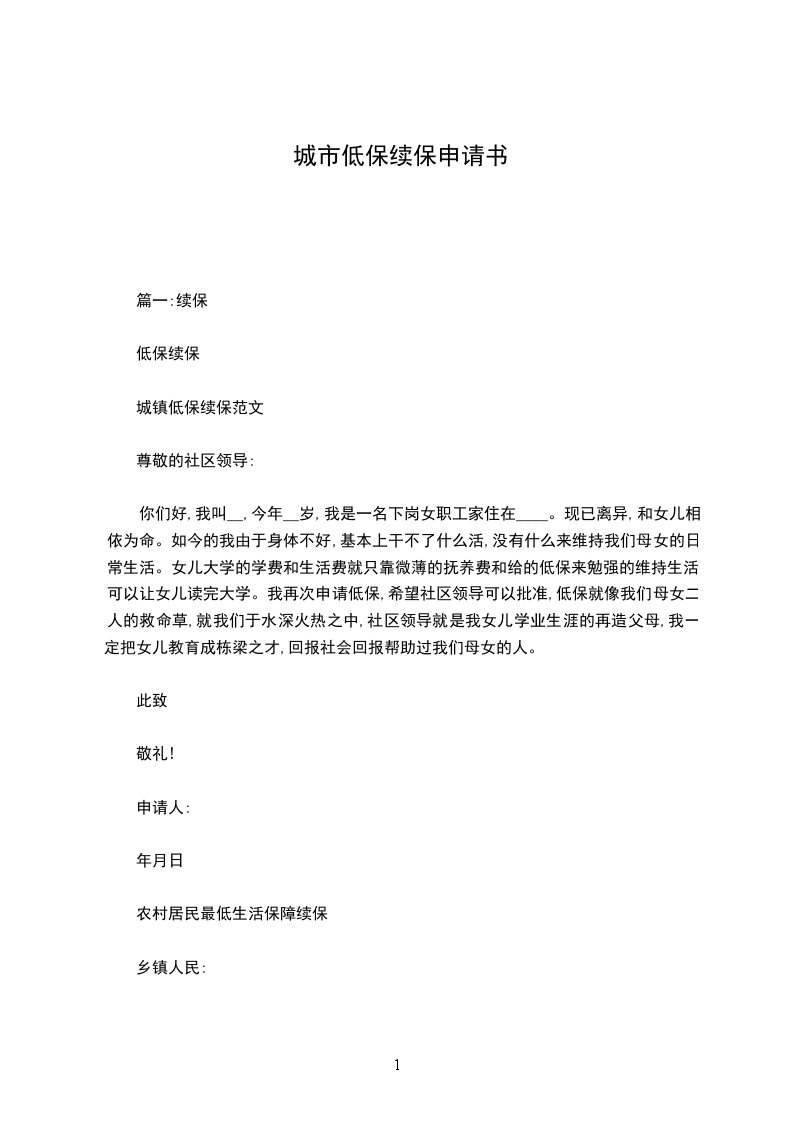 你们好,我叫__,今年__岁,我是一名下岗女职工家住在____。现已离异,和女儿相依为命。如今的我由于身体不好,基本上干不了什么活,没有什么来维持我们母女的日常生活。女儿大学的学费和生活费就只靠微薄的抚养费和给的低保来勉强的维持生活,可以让女儿读完大学。我再次申请低保,希望社区领导可以批准,低保就像我们母女二人的救命草,就我们于水深火热之中,社区领导就是我女儿学业生涯的再造父母,我一定把女儿教育成栋梁之才,回报社会回报帮助过我们母女的人。